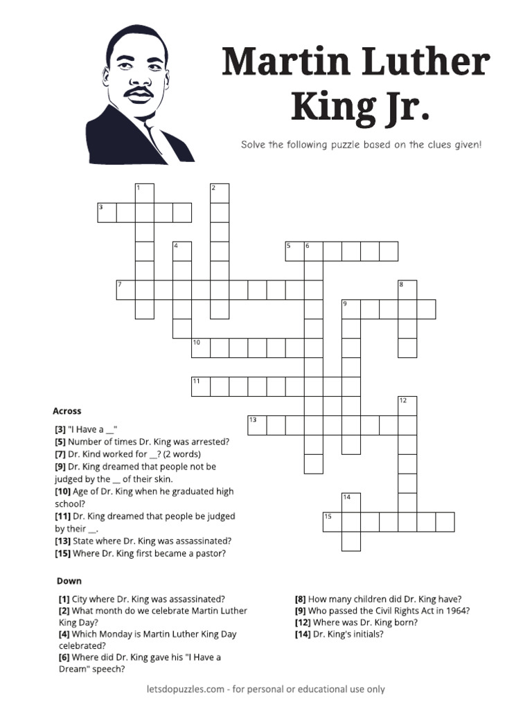 Martin Luther King Jr Day Crossword Puzzle • Beeloo Printable Crafts