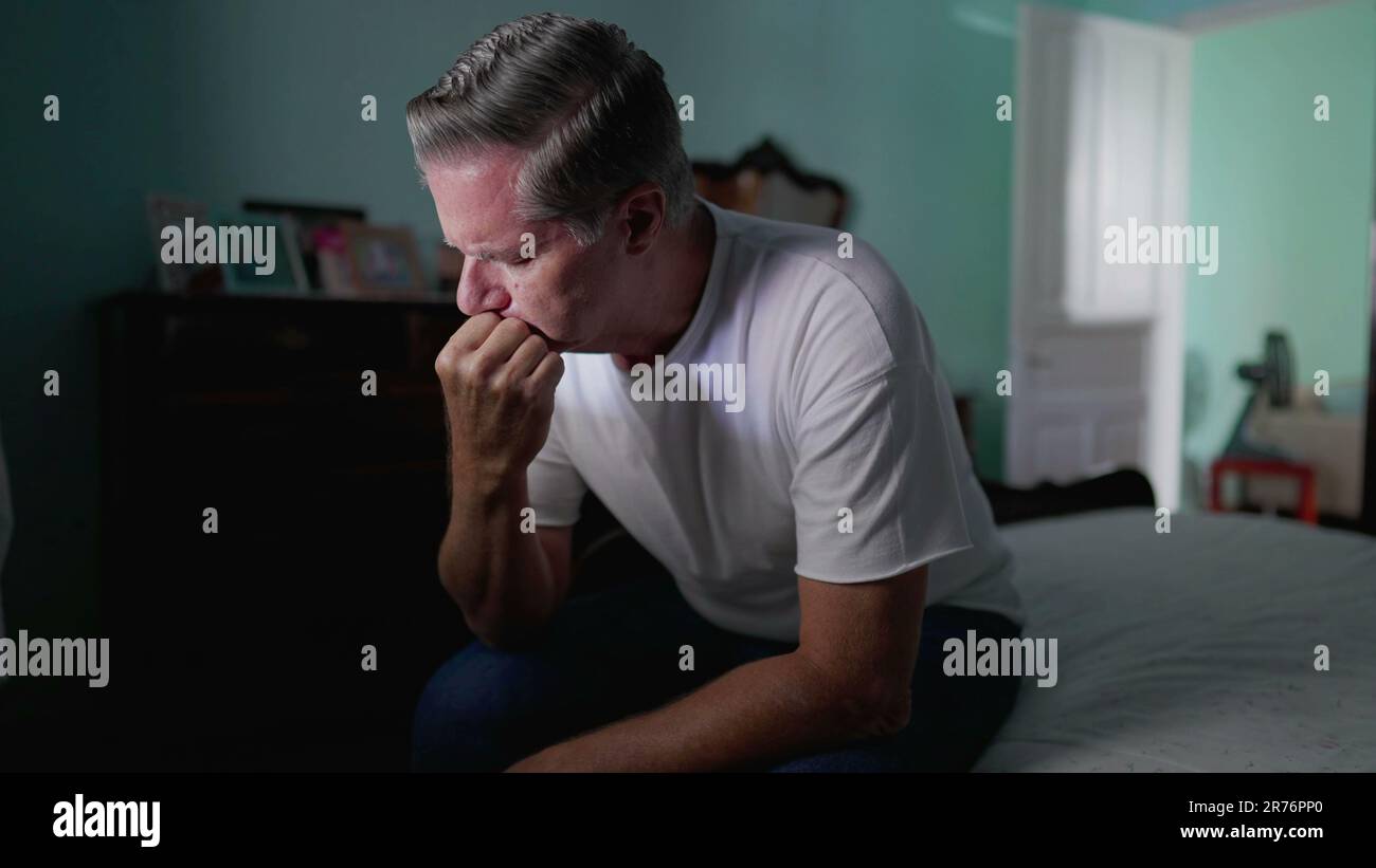 Anxious preoccupied older man sits by bedside feeling worry Stressed