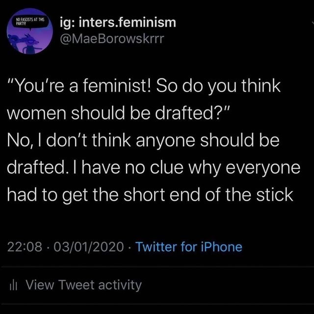 quot You #39 re a feminist So do you think women should be drafted? quot No I don