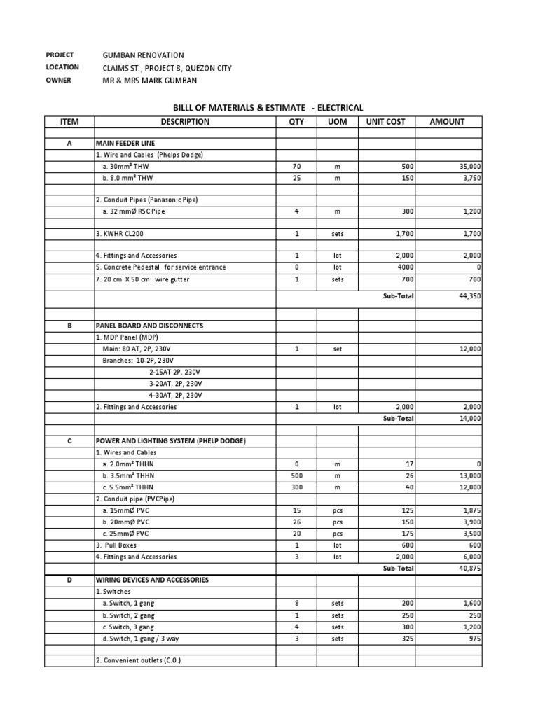 Billl of Materials Estimate Electrical: Item Description UOM Unit