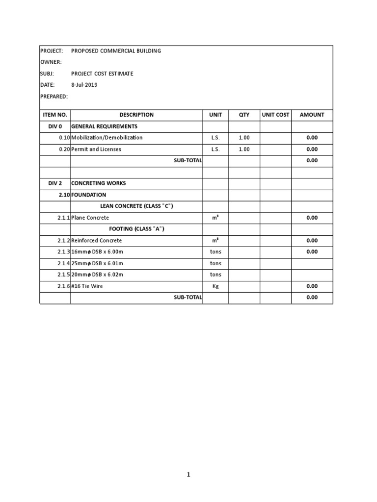 Item No Description Unit QTY Unit Cost Amount Div 0 General