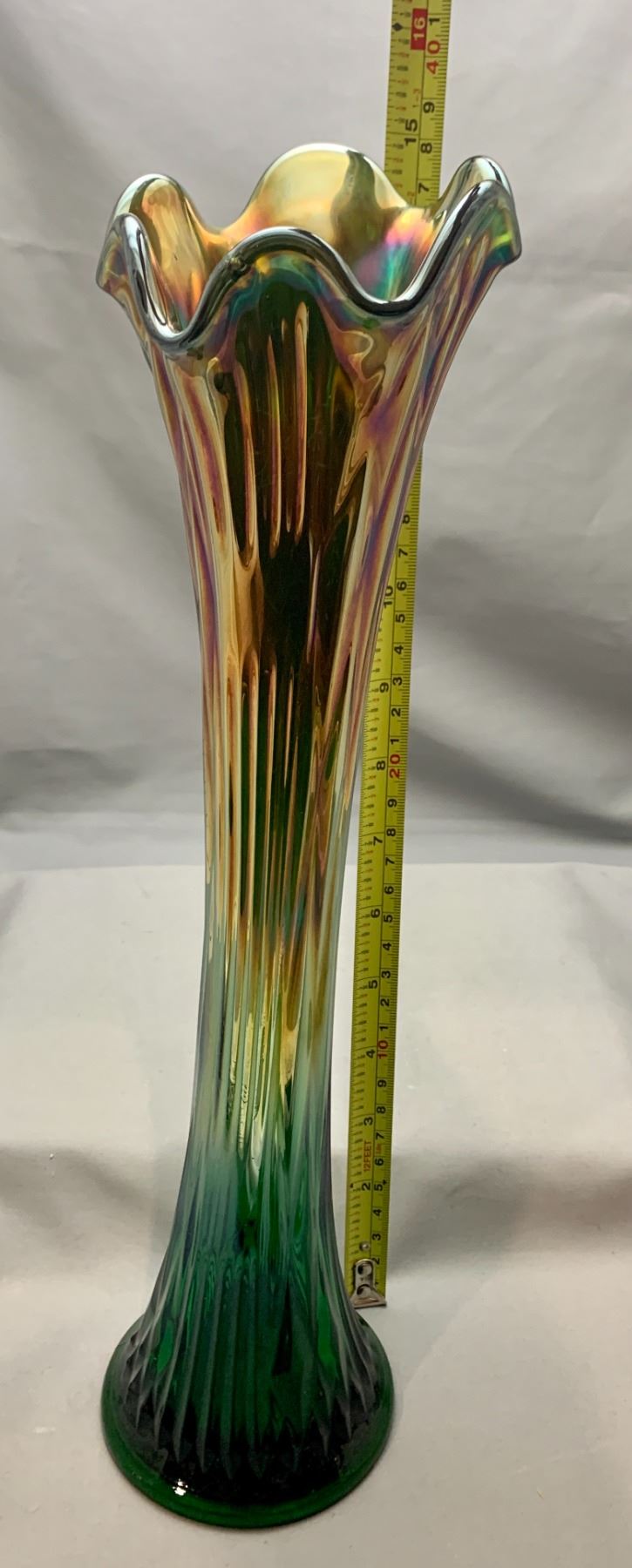 Fenton Green Spearhead Rib Carnival Glass 14 7/8 Tall Funeral vase
