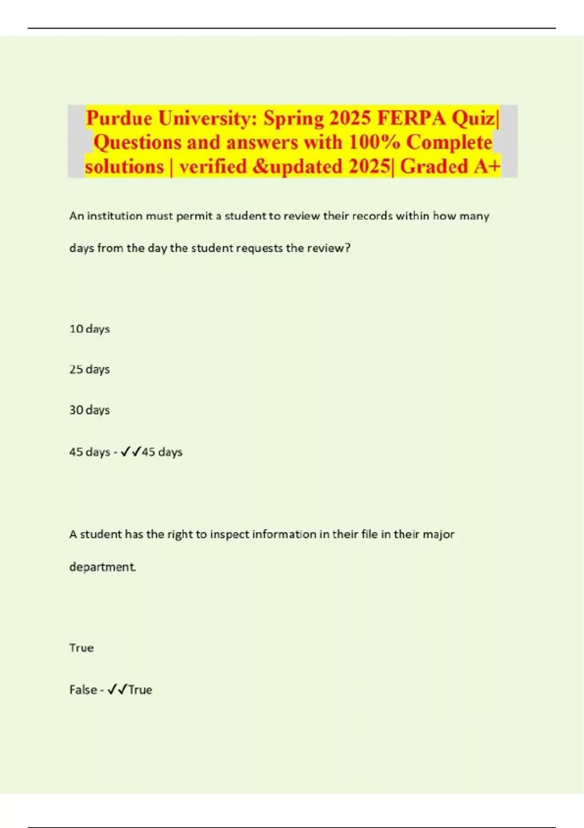 Purdue University: Spring 2025 FERPA Quiz Questions and answers with