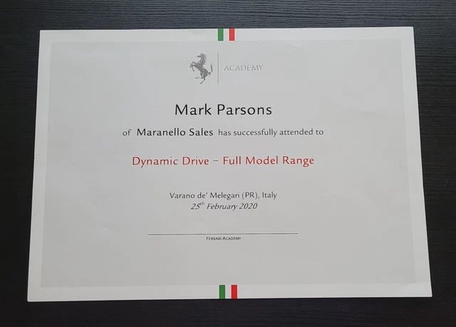 FERRARI MARENELLO SALES certificate scarce for Mark Parsons for Dynamic