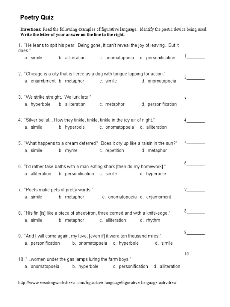 Figurative Language Quiz Worksheet Language Worksheets