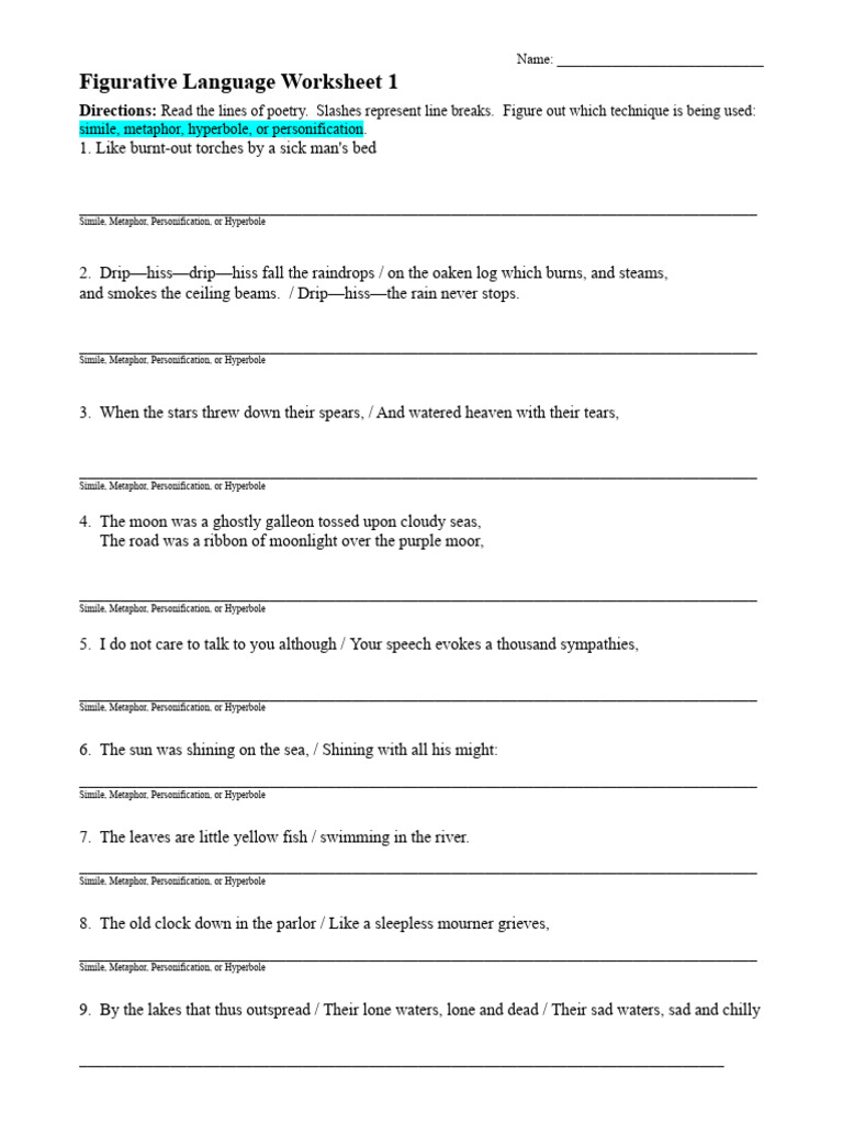 Figurative Language Examples Worksheet Language Worksheets
