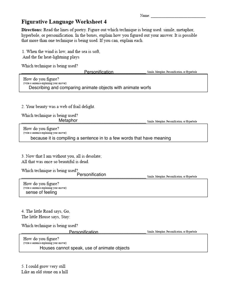 Figurative Language Worksheet 4 Answer Key Language Worksheets