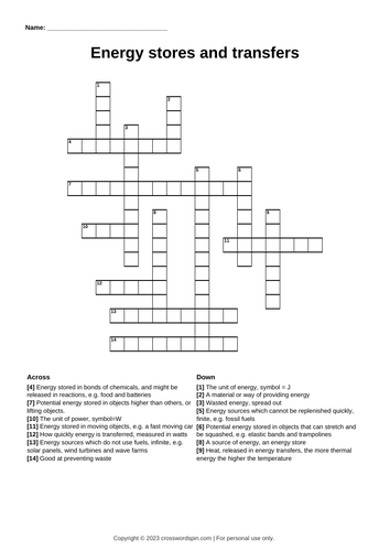 Energy Stores and Transfers Crossword Physics Beyond