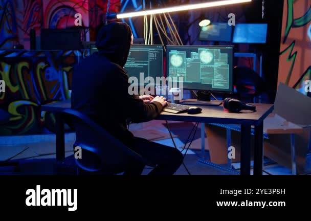Vertical video Jolly hacker in graffiti painted hideout excited after