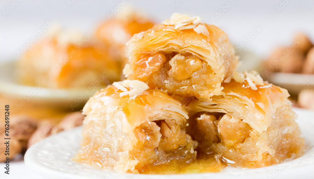 Turkish or arabic sweet dessert baklava made from filo pastry filled
