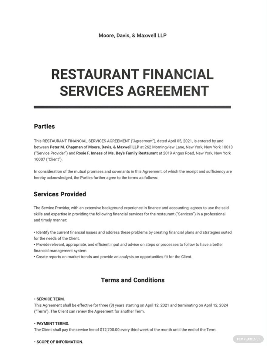 Restaurant Financial Services Agreement Template in Pages Word Google