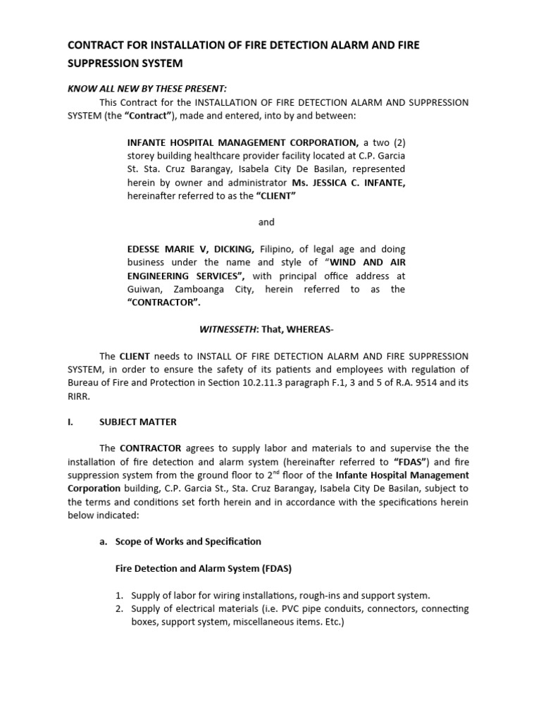 Contract for Installation of Fire Detection Alarm and Suppression