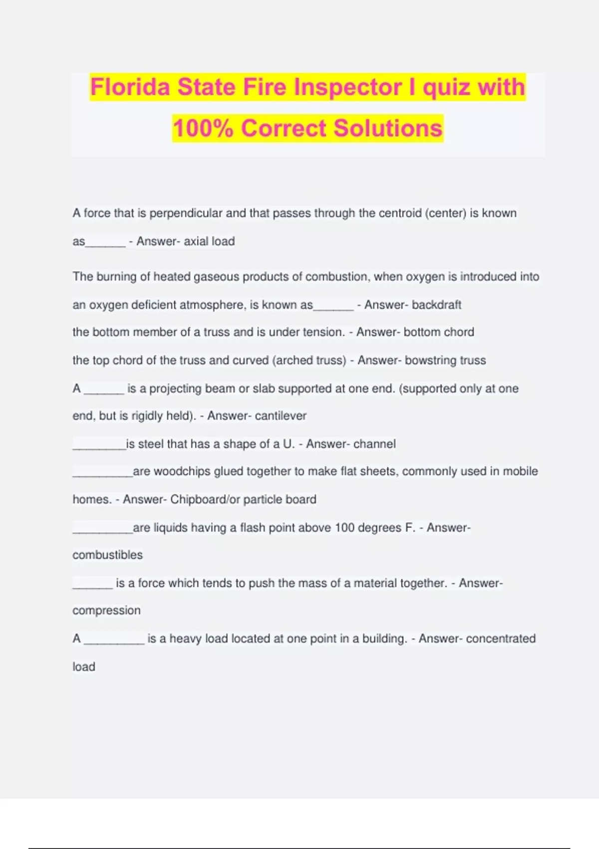 Florida State Fire Inspector I quiz with 100% Correct Solutions