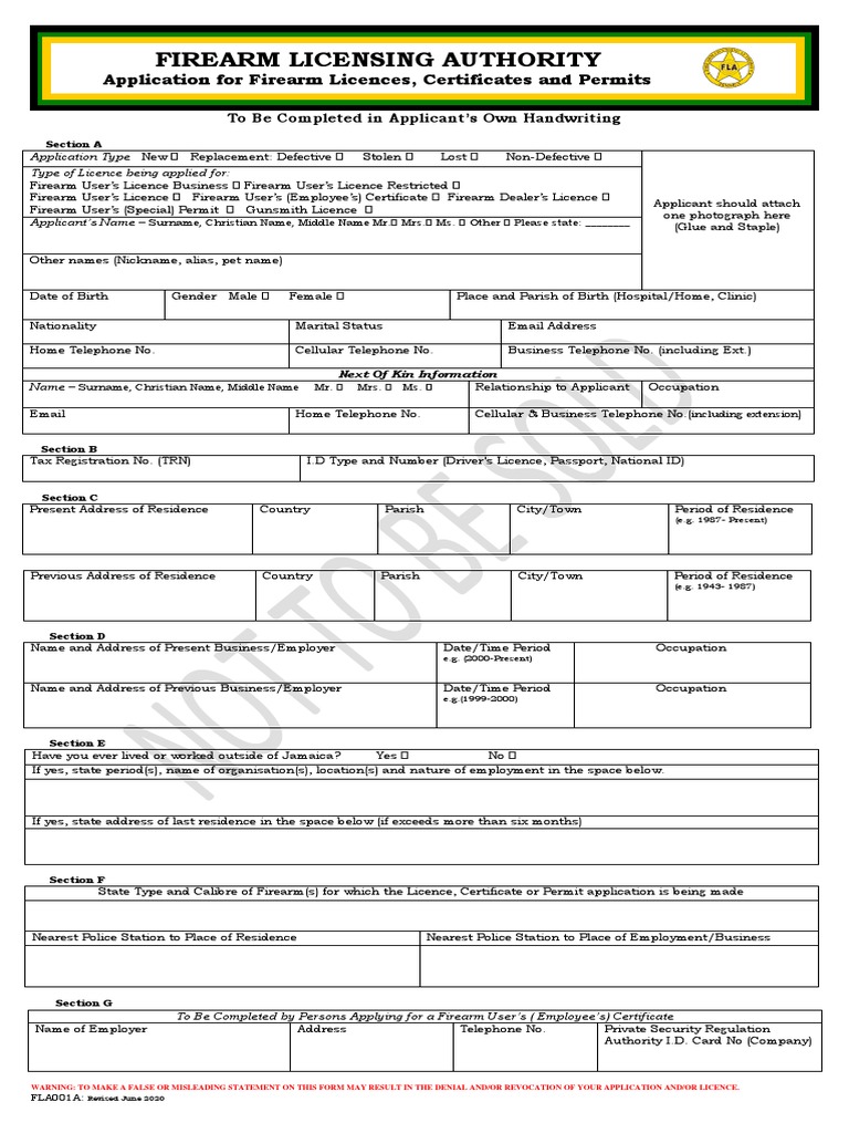 FLA001A Application For Firearm Licences Certificates and Permits