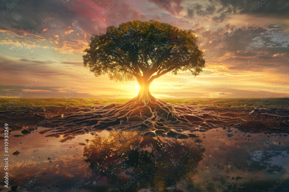 a tree with deep roots firmly planted in the ground reaching upward