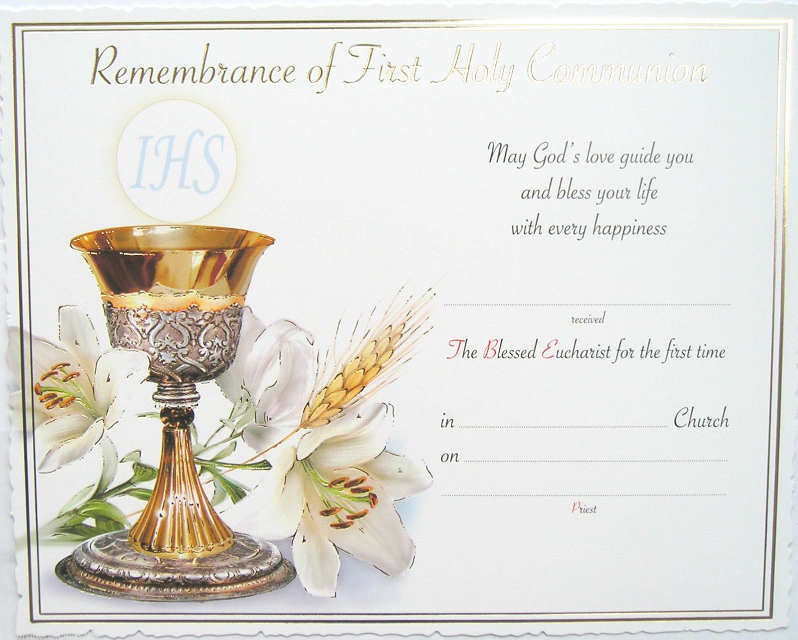 First Communion Certificate Blank (50) Reilly #39 s Church Supply Gift