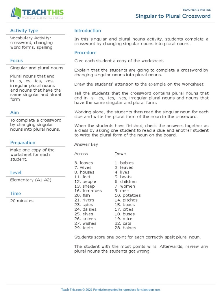 Irregular Plural Nouns Crossword Puzzle Unterrichtsmaterial im Fach