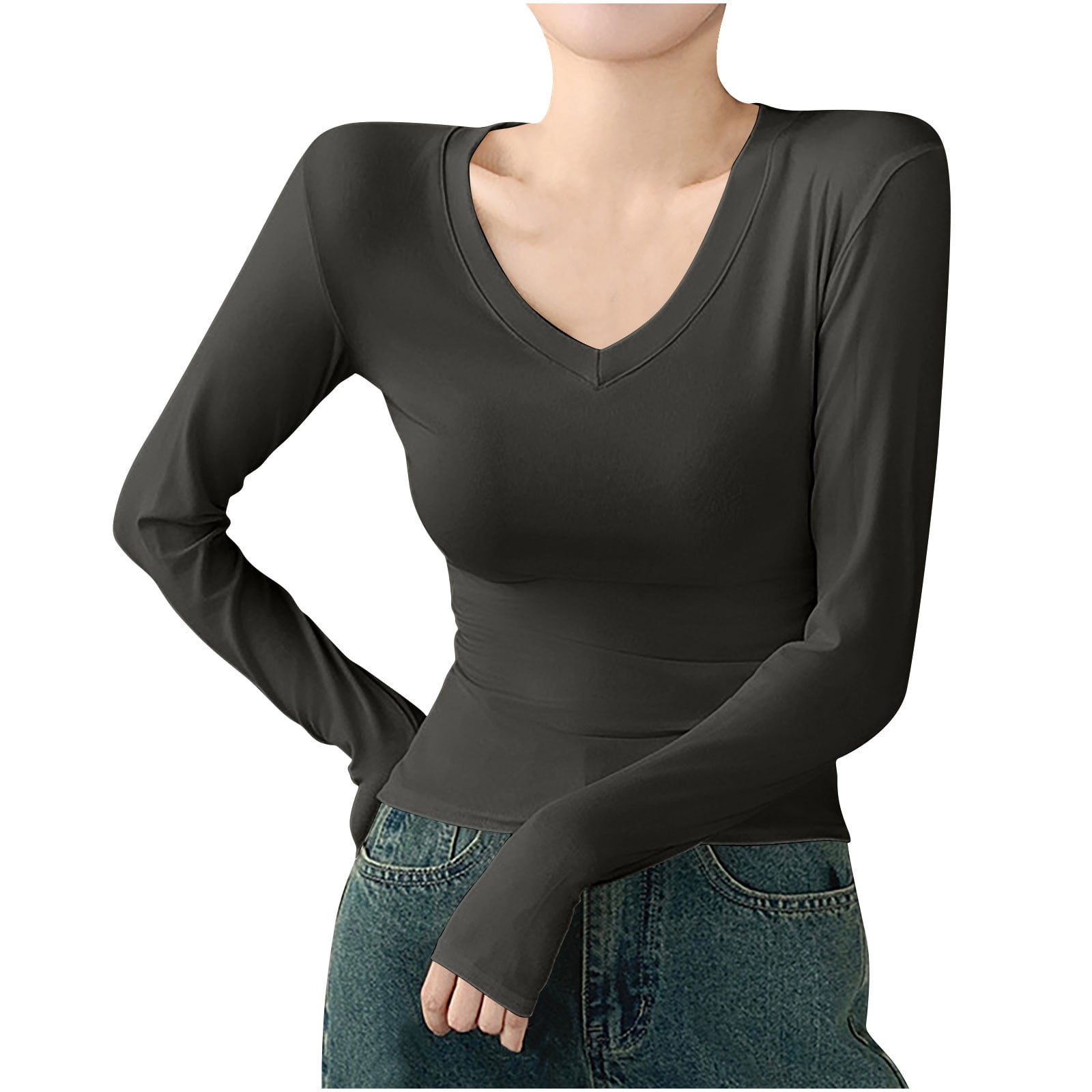 tarylea Women Blouse V Neck Long Sleeve Tops Solid Color Fitted Tops
