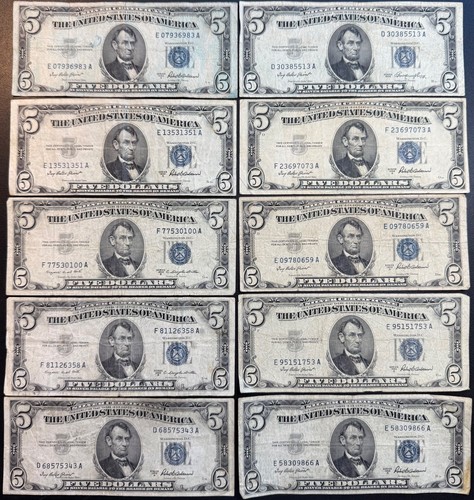 Lot of 10x 1953 $5 Five Dollar SILVER CERTIFICATE Notes *NO RESERVE 99C