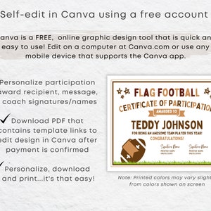 Flag Football Certificate Editable Canva Participation Achievement A4