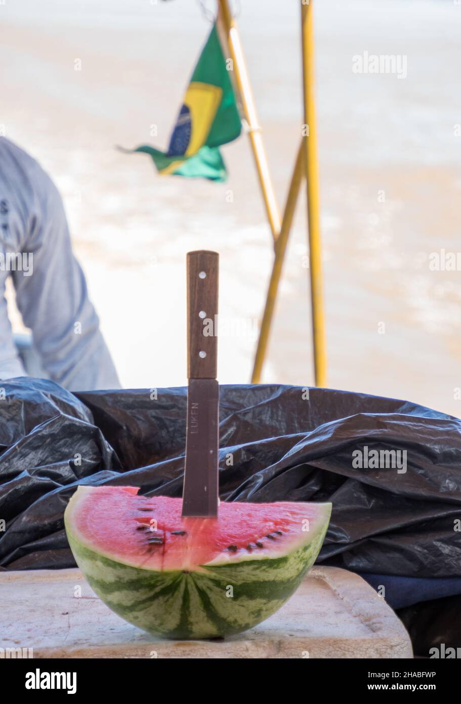 Tabatinga Brazil Nov 2019: Half a watermelon with a large knife