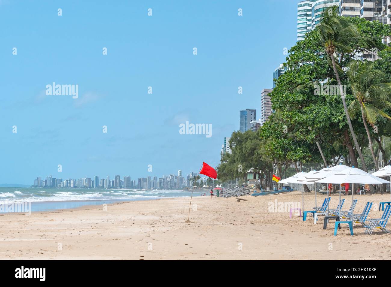 Beautiful beach with a red flag signaling danger in the water Beach of