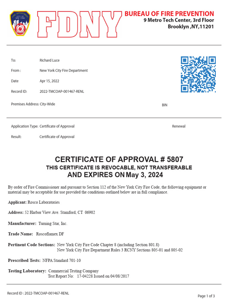 Roscoflamex DF Flame Retardant Certificate FDNY 2022 2024 0 PDF