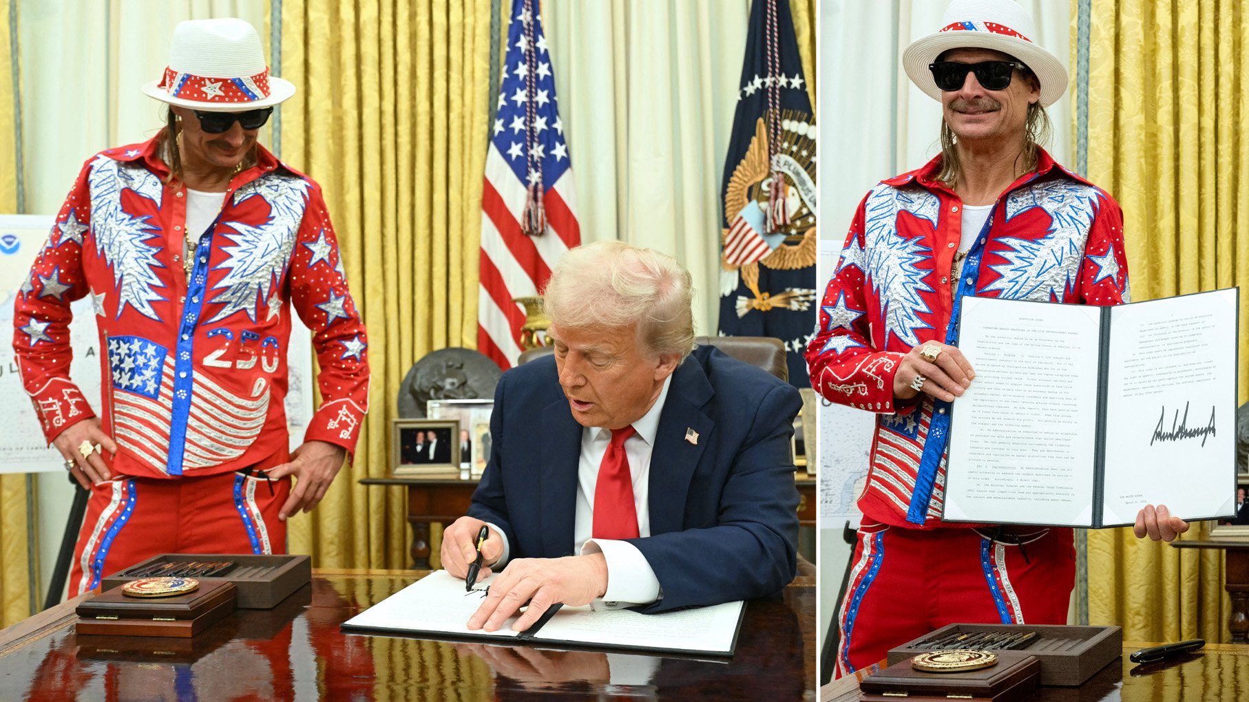Donald Trump jokes he #39 ll wear Kid Rock #39 s flashy US flag suit on April