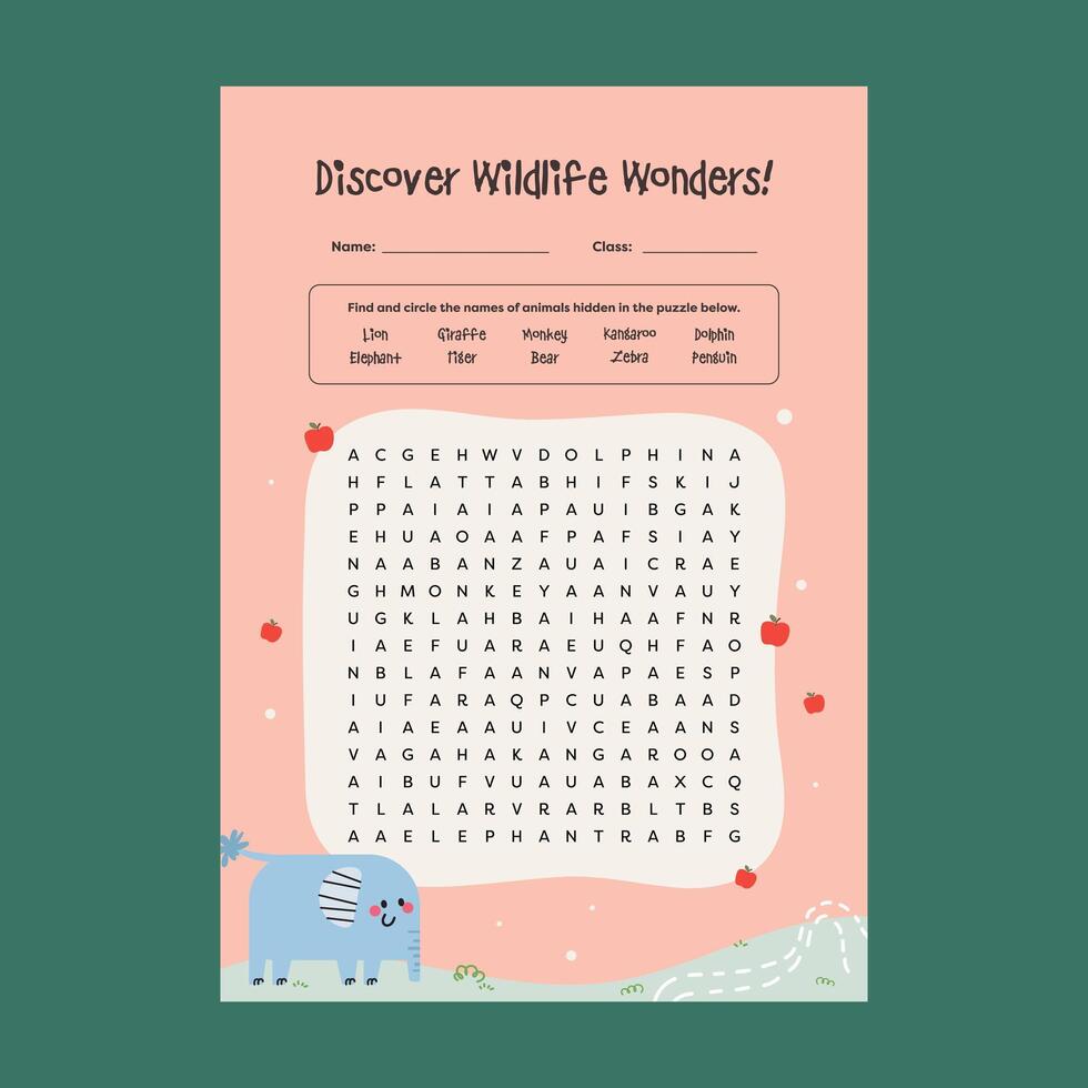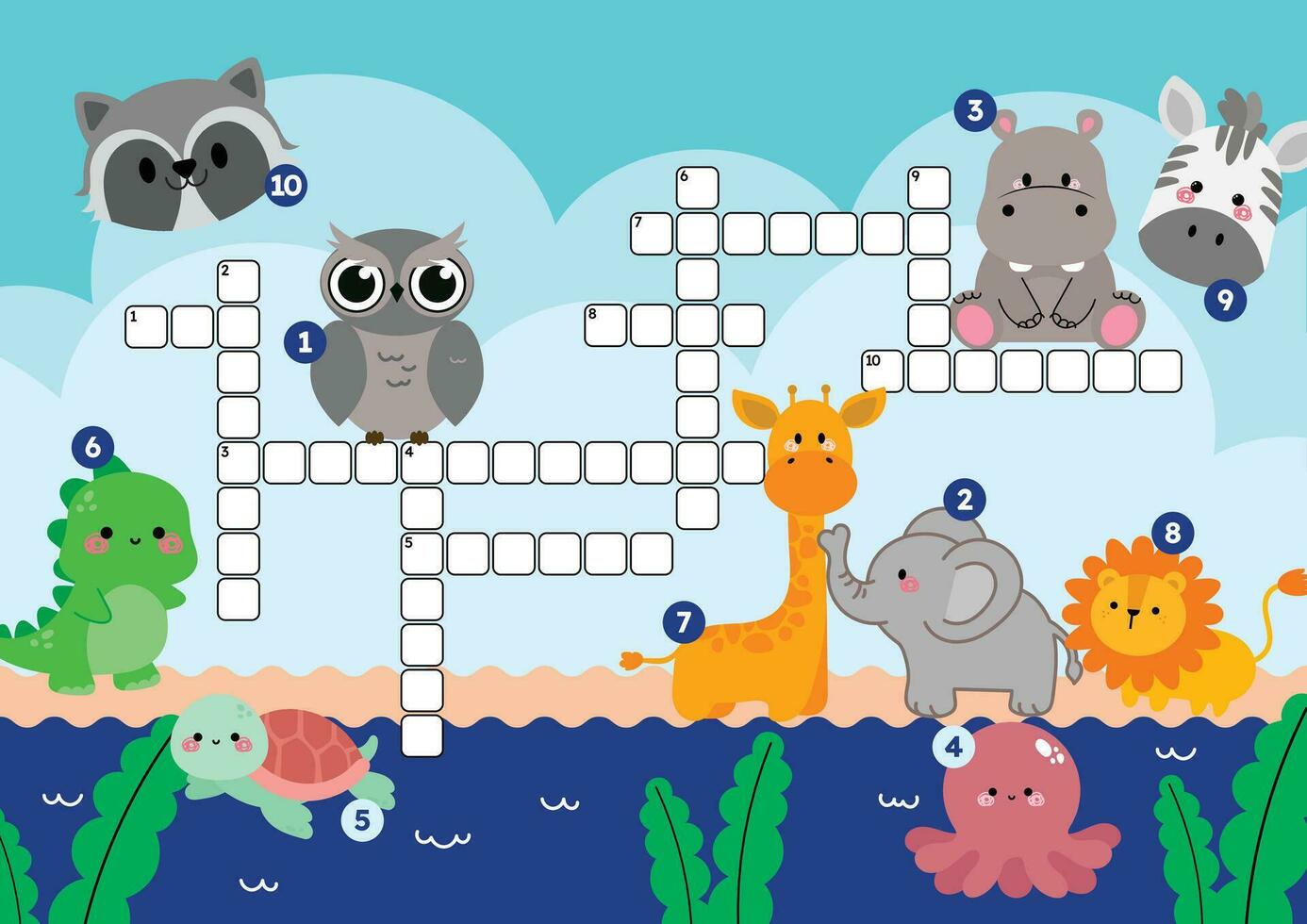 flat design vector animal Crossword puzzle worksheet printable for kids