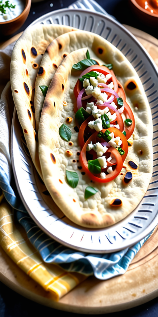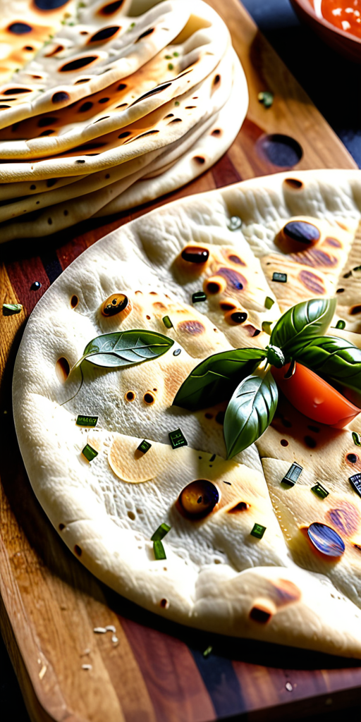 Freshly Made Flatbreads with Herbs and Spices on a Wooden Board