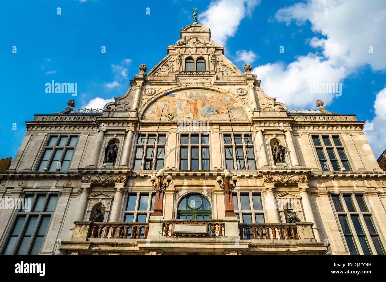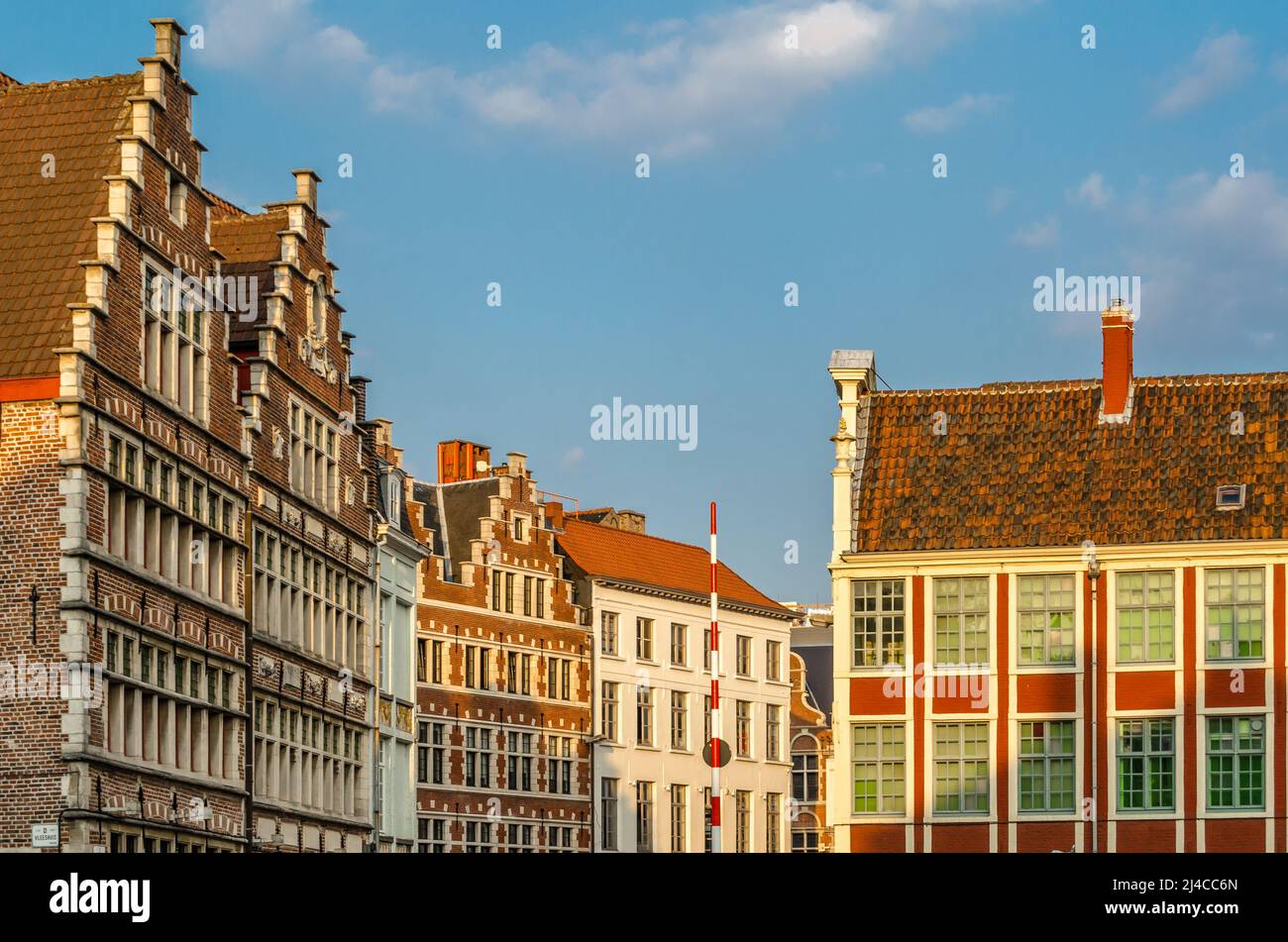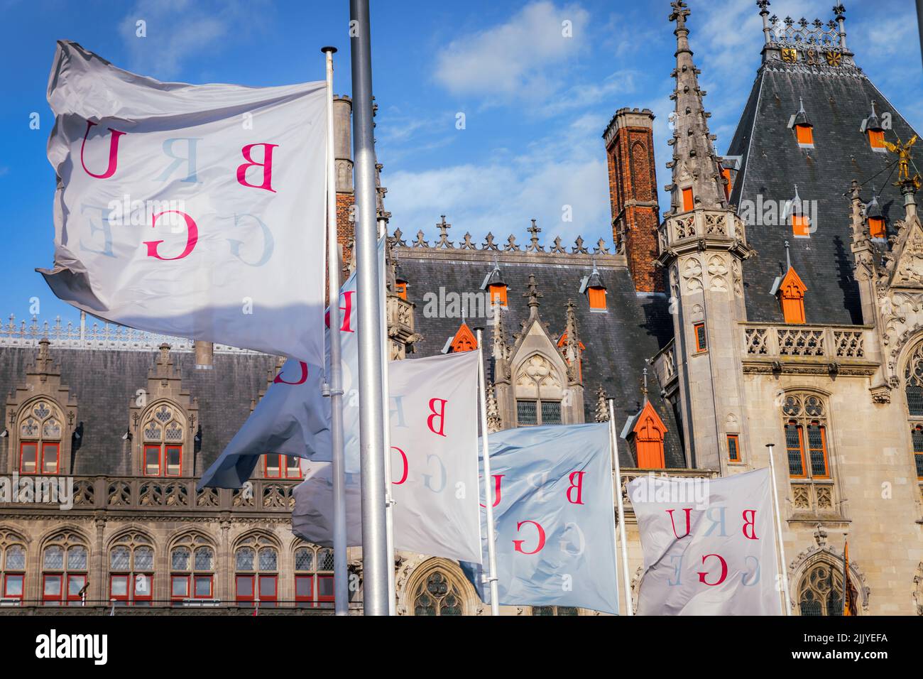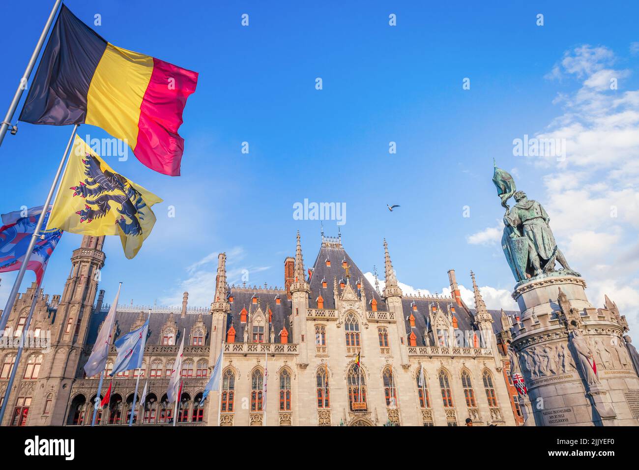 Belgian flags flemish architecture in Bruges market square Stock Photo