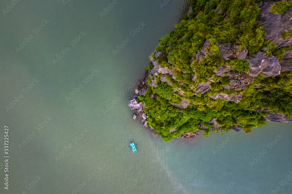 Aerial view Ba Hang floating fishing village rock island Halong Bay