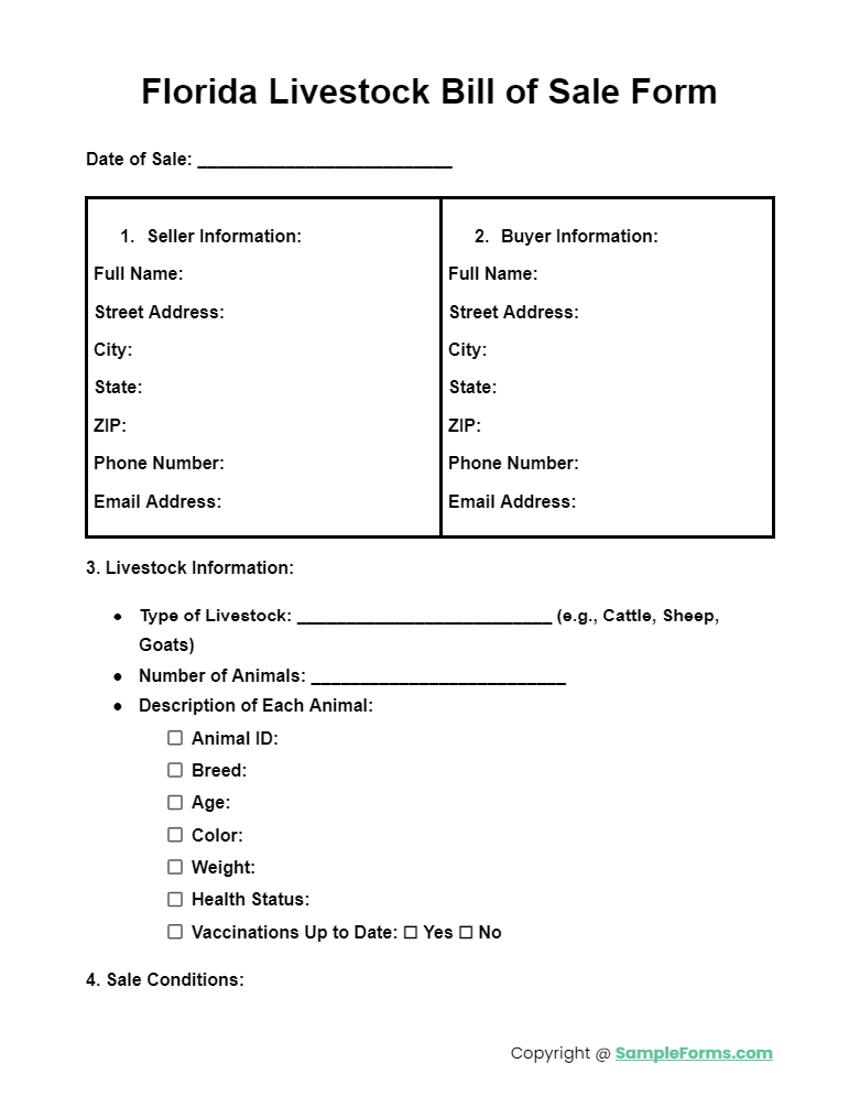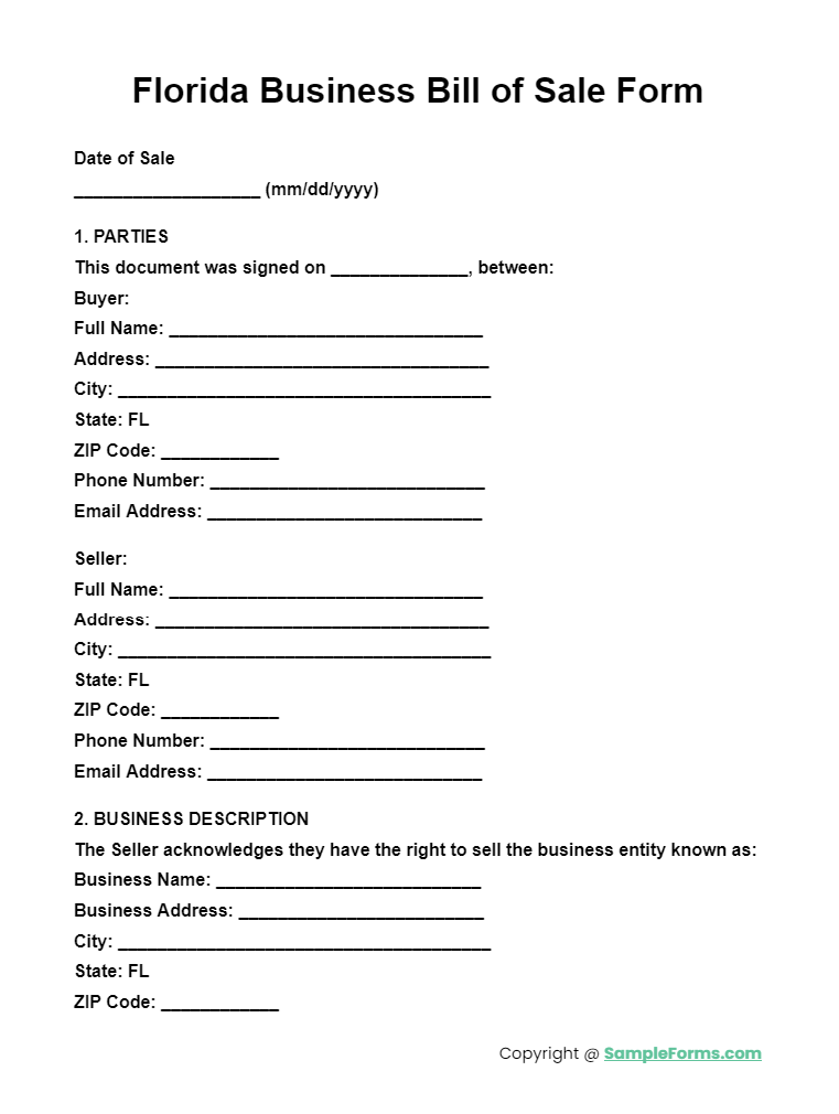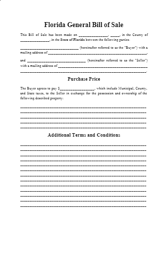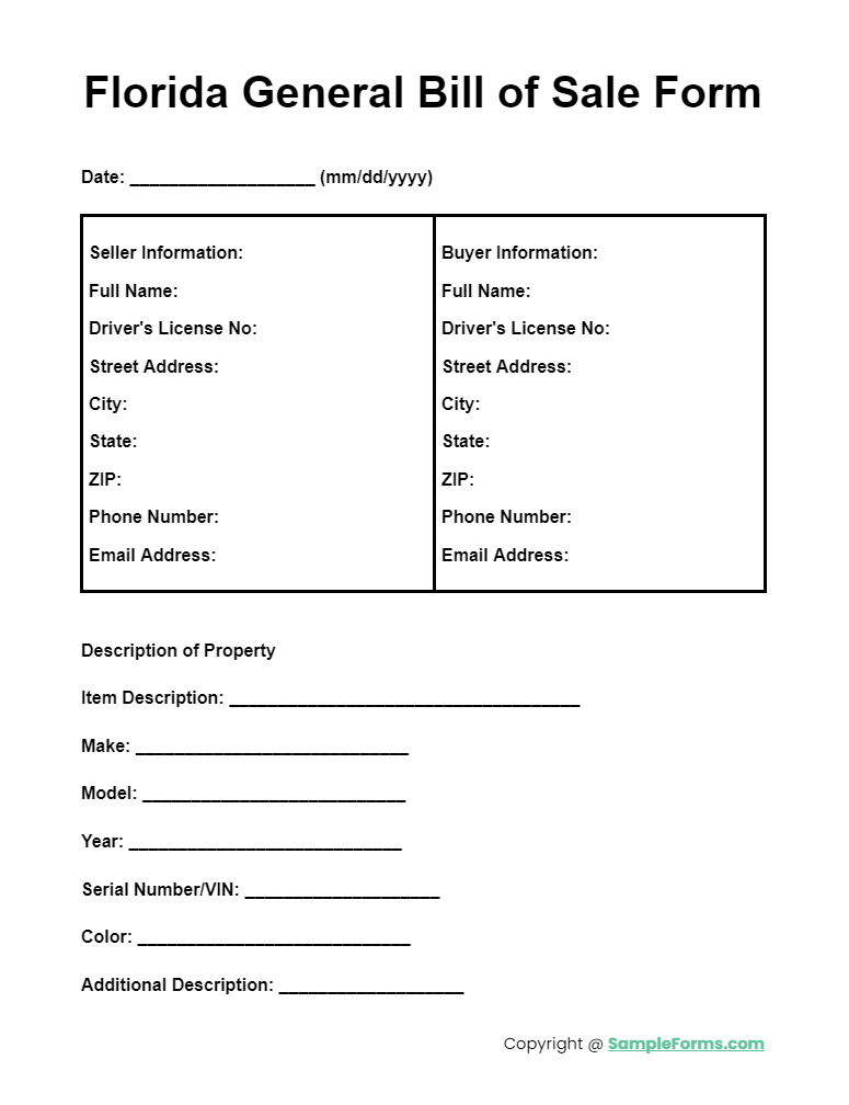 Florida Bill of Sale Form Template Blank Printable in PDF Word
