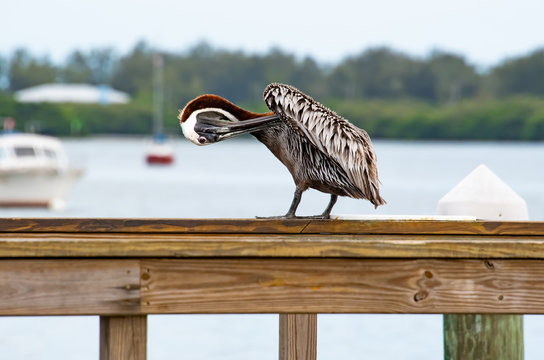 Pelican Standing To The Right On Pier On Galveston Bay Stock Photo