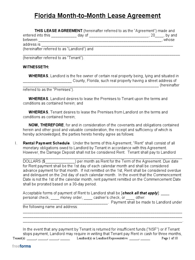 Free Florida Month to Month Lease Agreement Template PDF Word
