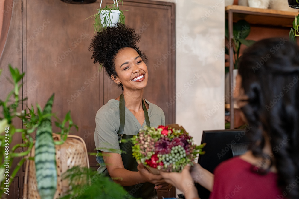 Happy black florist selling flowers to young woman Stock Photo Adobe
