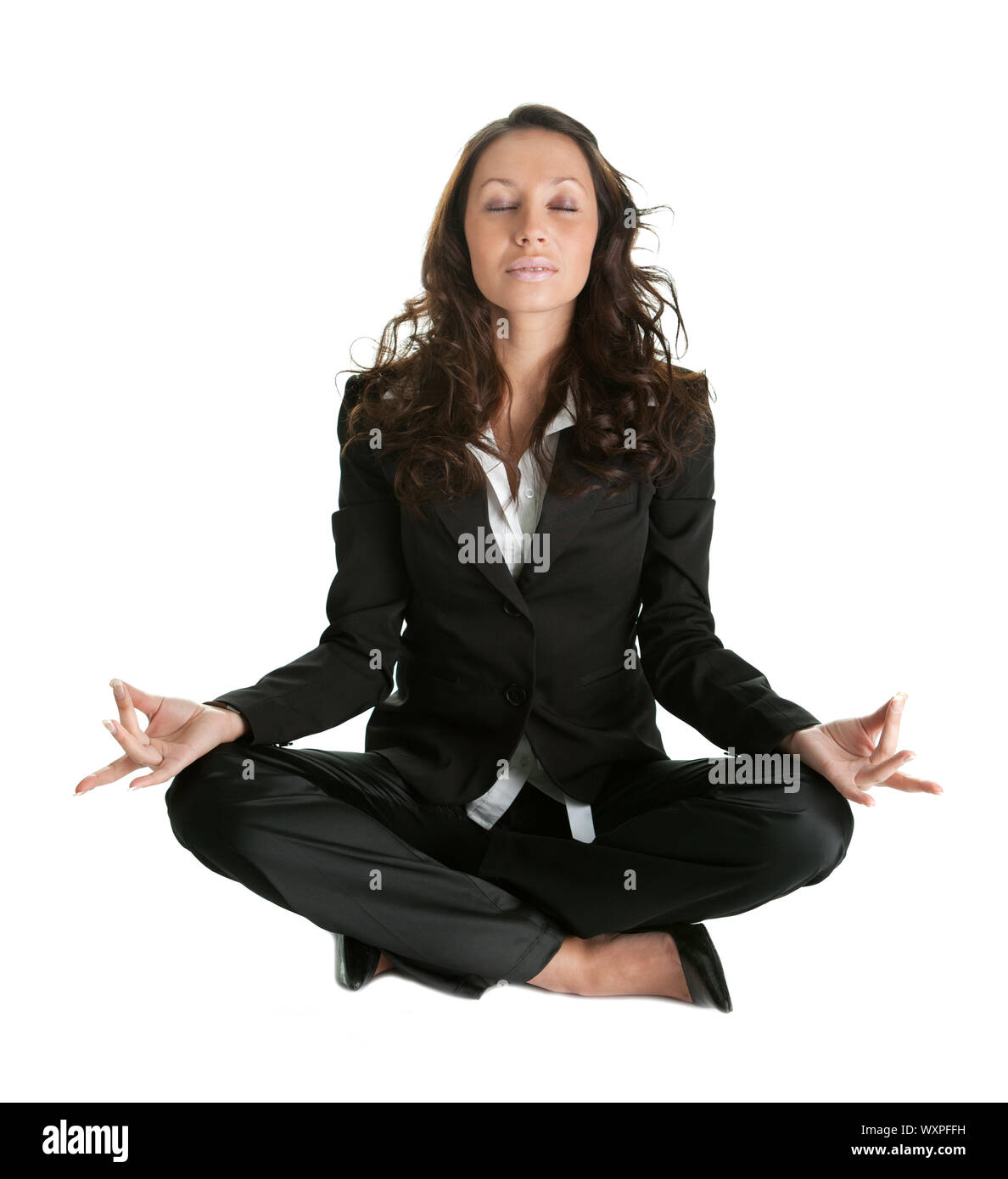 Businesswoman sitting in lotus flower position of yoga Isolated on