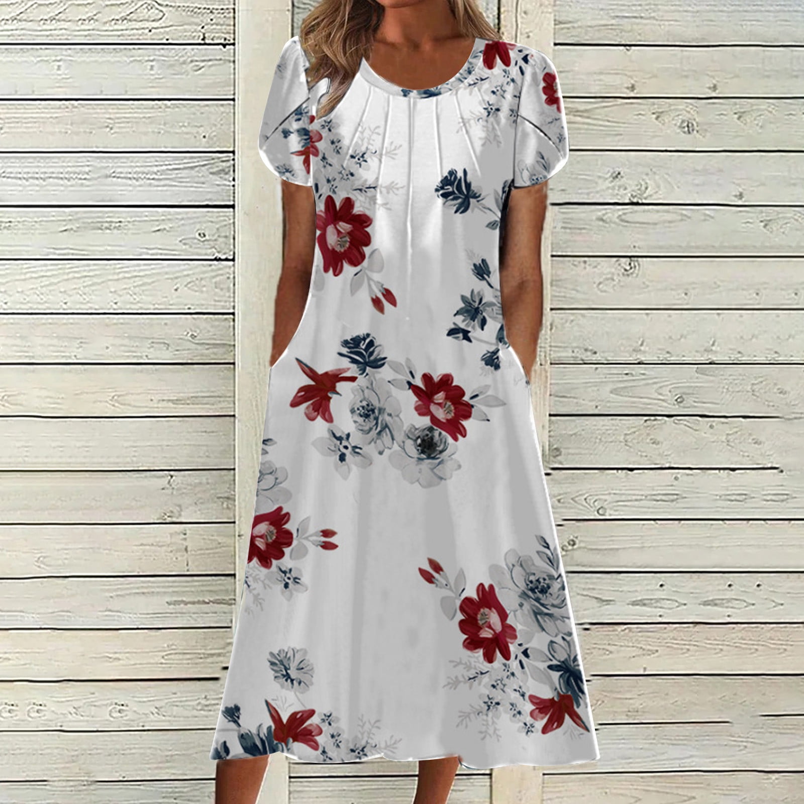 QUNYINEY Womens Dresses Floral Casual Short Sleeve A Line Dress Pleated