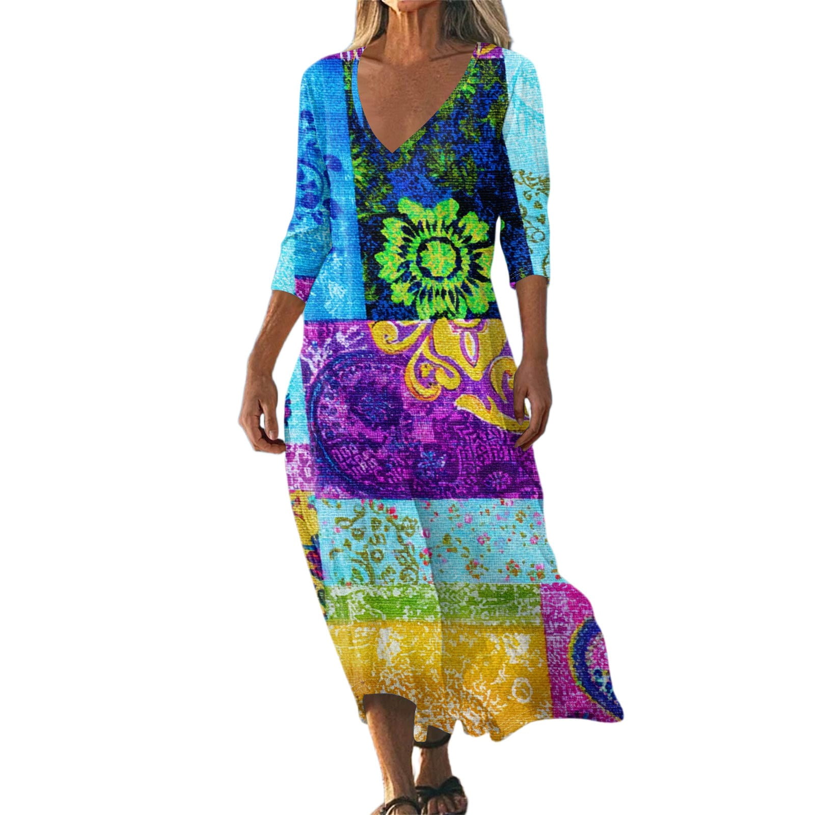 dGslk Women #39 s Bohemian Patchwork Maxi Dress with 3/4 Sleeves V Neck