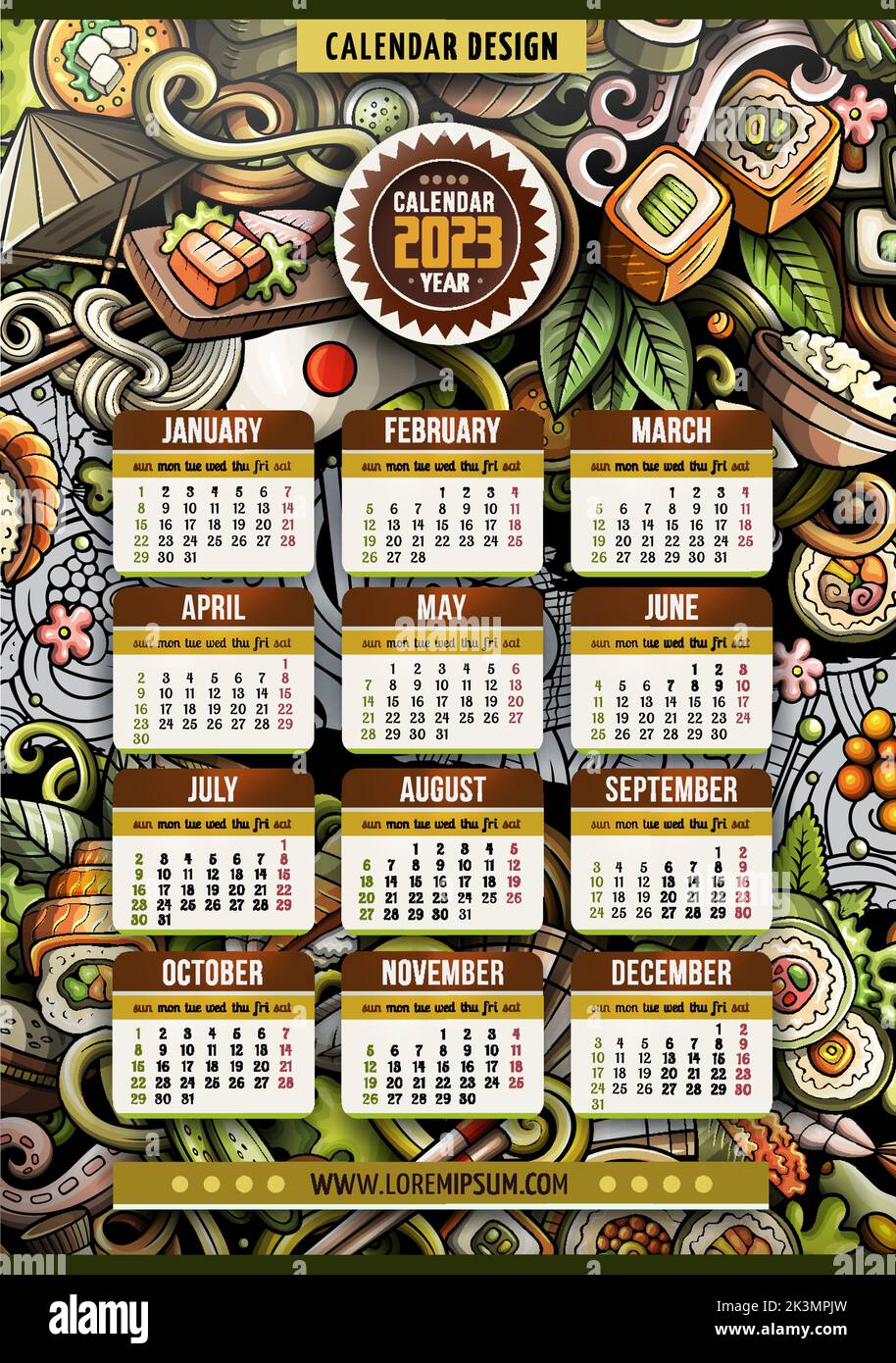 Cartoon doodles Japanese food 2023 year calendar template Stock Vector