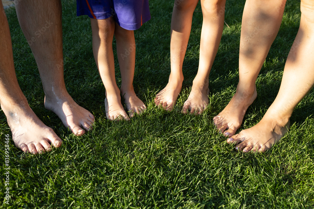 Family Feet and Lawn with Children Parents and Summer Fun Together