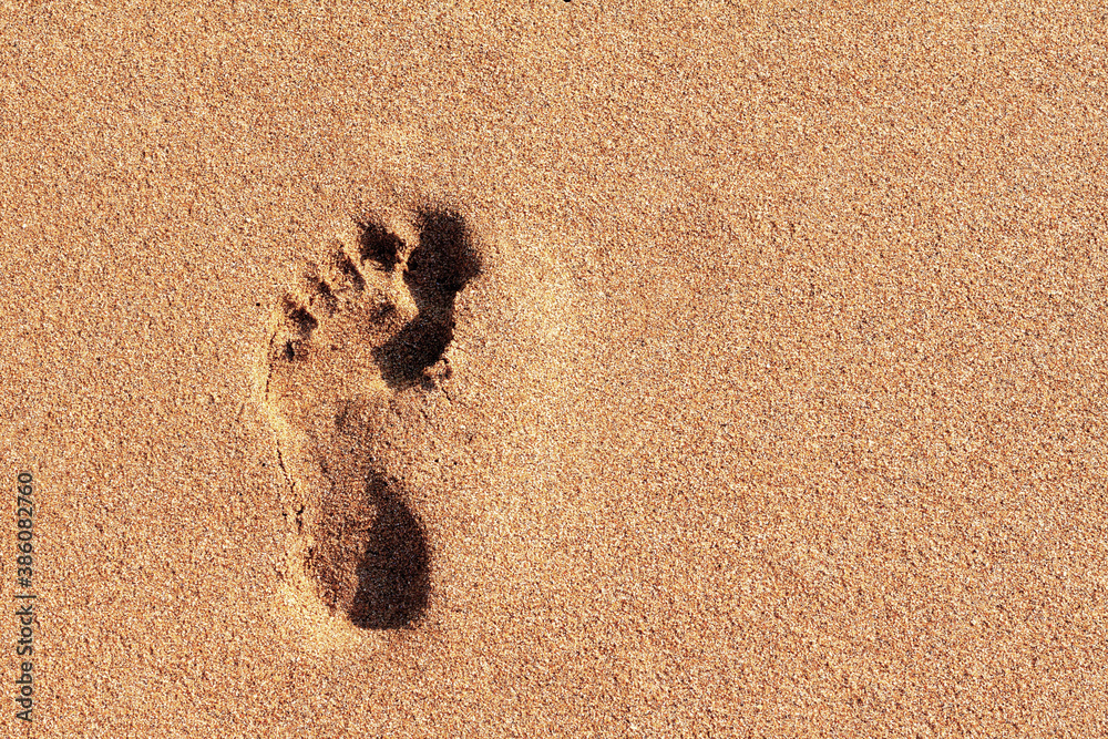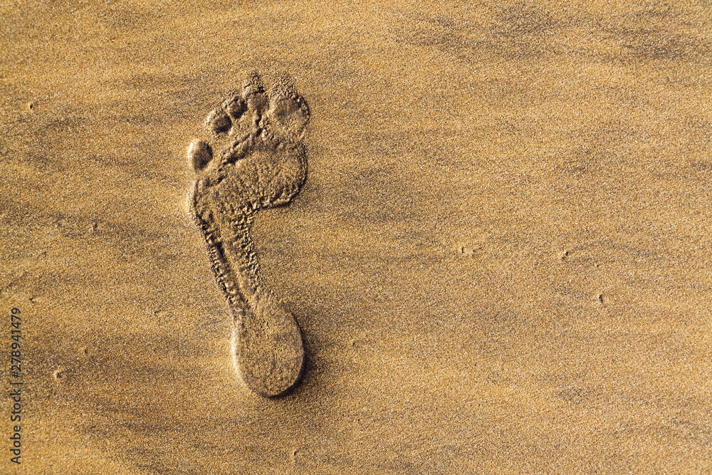 Single human barefoot footprint of left foot in brown yellow sand beach