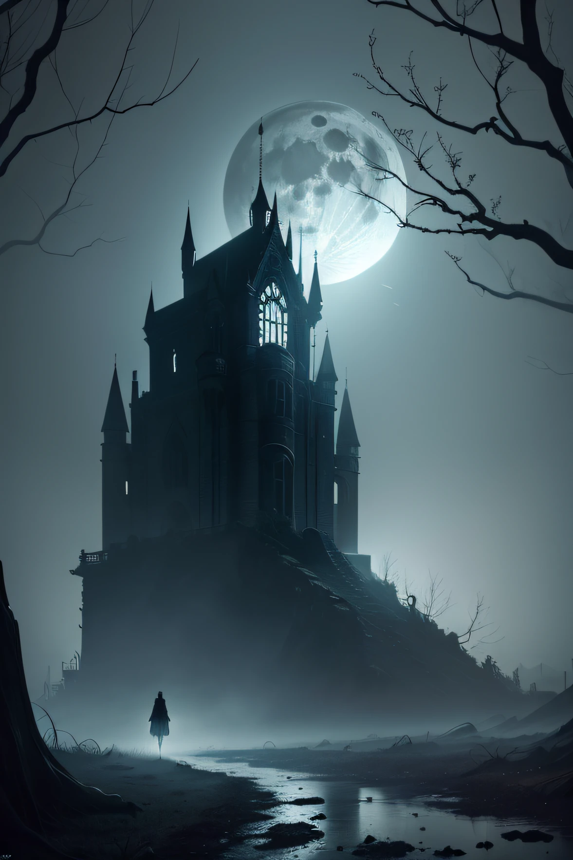 A woman in a black dress standing in a forest with a full moon SeaArt AI