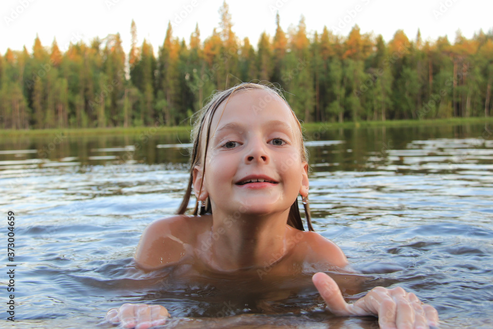wet head of a little girl swimming in the overgrown pond Stock Photo