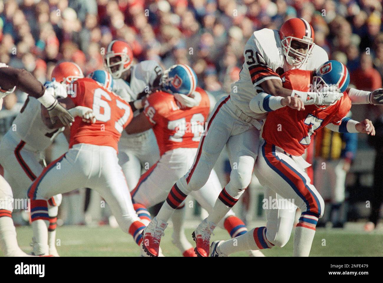 Denver quarterback John Elway (7) is wrapped up by Cleveland safety