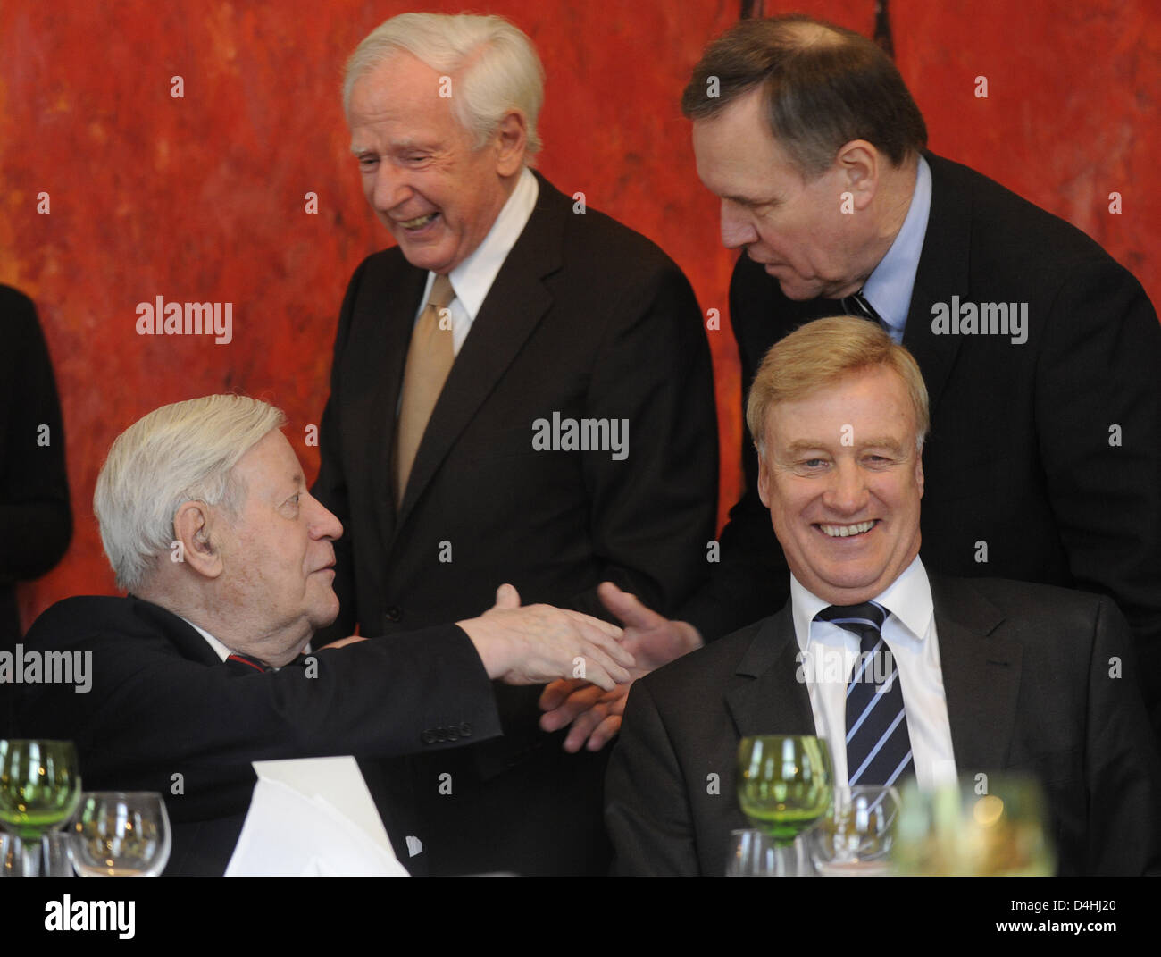 Former German Chancellor Helmut Schmidt (L seated) welcomes Hamburg?s
