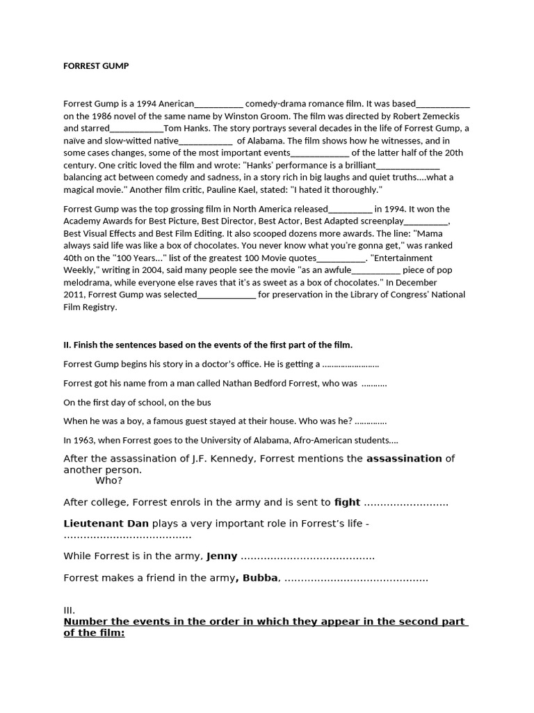 Forrest Gump Movie Worksheet Answers Printable And Enjoyable Learning