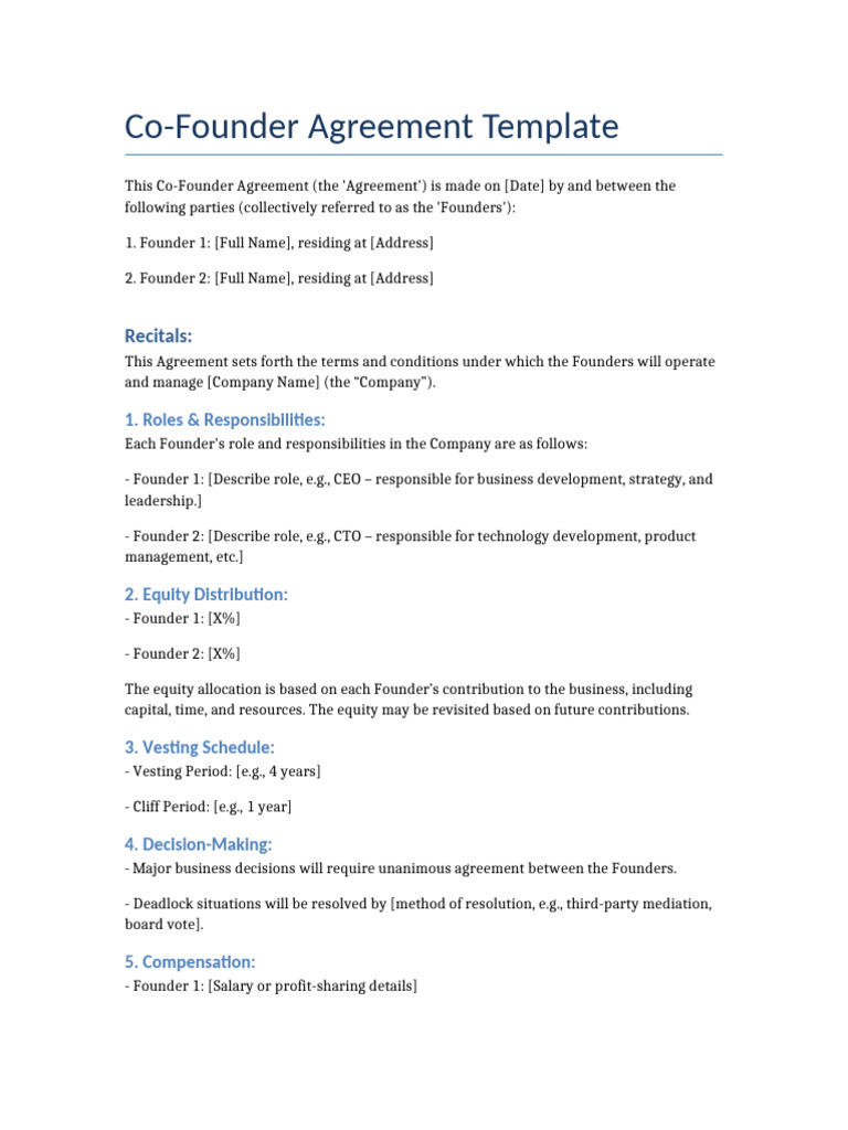 Co Founder Agreement Startup Template Google Docs Word Apple Pages