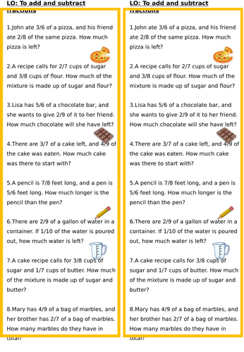 Year 4 5 6 Fraction Addition Subtraction Word Problems Teaching