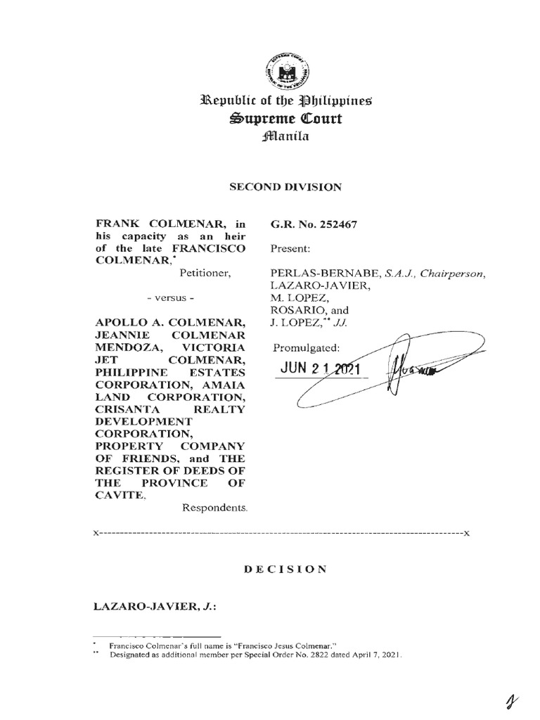 Frank Colmenar in His Capacity As An Heir of The Late Francisco